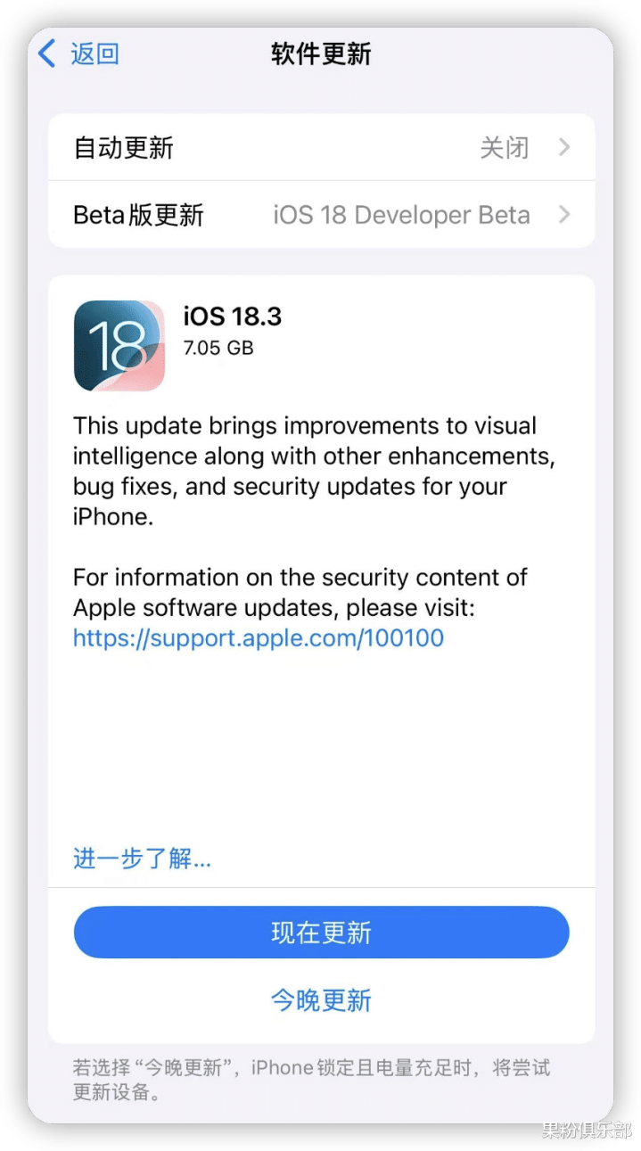 设置完毕后,稍等一会就能收到 iOS 18.3 测试版的更新推送了。